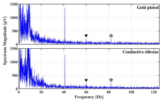 Power spectrum of EEG signals recorded on subject #3 with gold-plated electrodes (top), and conductive silicone electrodes (bottom). Peaks indicated with asterisks correspond to the second harmonics of the 41 Hz responses, which are particularly visible in this subject. Power line artifacts are indicated by solid triangles.