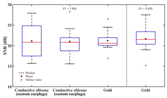 CochlEEG was previously presented in a paper by the authors as a portable EEG data acquisition platform able to reliably record good quality EEG data with sampling rates of up to 2 kHz [24]. Thanks to a recent update of the firmware, the 4 kHz sampling frequency is now fully functional. Therefore, it was of interest to the authors to demonstrate the CochlEEG’s recording capability of EEG data at 4 kHz. Results in Figure 11 indicate that SNRs obtained with CochlEEG at 1000 Hz seem comparable to those obtained at 4000 Hz. This observation was confirmed by a Friedman rank sum test, which fails to reject the null hypothesis at a 5% significance level (p = 0.999), providing strong evidence that ASSRs collected at 1000 Hz are not statistically different from those collected at 4000 Hz.