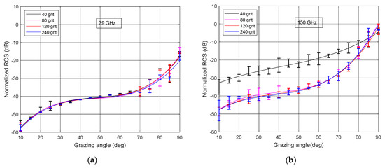 As a reference point, we chose a radar with a center frequency of 79 GHz and 4 GHz bandwidth. The measured normalized RCS at 79 GHz is shown in Figure 7a for different sandpapers. The results were averaged over six or more measurements; the error bars show the obtained standard deviation.