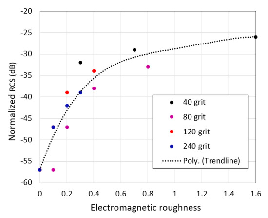 Figure 8 shows discrete values of normalized RCS versus electromagnetic roughness (see Table 3) for different sandpapers at a grazing angle of 10°. The general trend for the normalized RCS to increase with increasing kh is clearly seen.