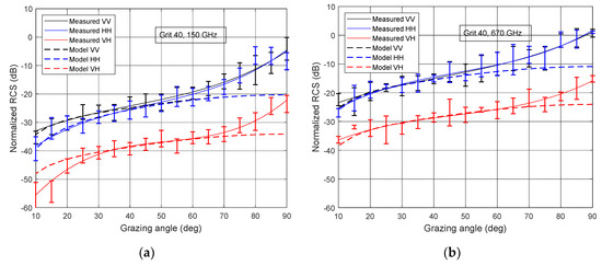 Figure 9 depicts the measured and calculated normalized RCS at different signal polarizations: and as a function of grazing angle increment. In this section, we restrict ourselves to considering reflection from sandpaper with two extreme values of roughness (grit 40 and grit 240) at two frequencies (150 GHz and 600 GHz), since the above examples illustrate well the general dependencies. The theoretical values are calculated using the empirical model explained in Section 3.2.