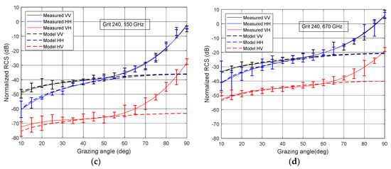 The normalized RCS for cross-polarized signal are significantly weaker than for co-polarized signal. In accordance with the empirical model, cross-polarized backscatter ratio q (Equation (10)) does not depend on the grazing angle. Indeed, in the case of 40-grit sandpaper, at a signal frequency of 150 GHz in the range of angles from 30° to 90°, the difference between the co-polarized and cross-polarized signal is about 16 dB (Figure 9a). At a signal frequency of 670 GHz, this difference was about 14 dB (Figure 9b). Similar dependences are observed for paper with grit 240 (Figure 9c,d).
