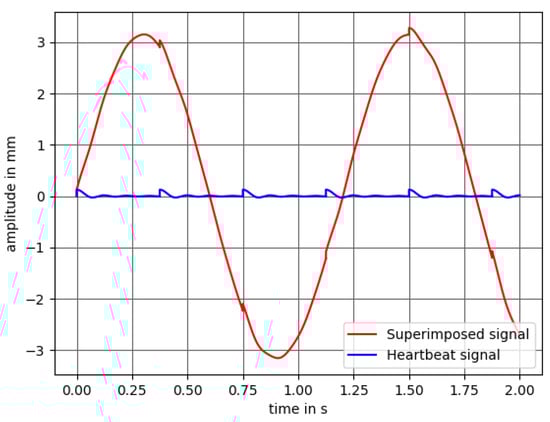 It is assumed that the amplitude of the respiratory rate of a preterm neonate has a stroke of around 2 mm and the displacement caused by the heartbeat is around mm. As there are no medical reference values available for the movement of the chest wall due to the heartbeat for neonates, we made an approximation. It is known that the chest wall displacement of adults ranges from 0.2– mm [56]. The dimensions of an adult heart are of around 12 cm × 8 cm × 6 cm [57]. A newborn heart has the size of a walnut with dimensions of around cm × cm × cm [58]. As we are considering the chest wall movement in the z-direction, we assume that for a newborn baby it is multiplied by a factor of . This leads to an approximated chest wall movement of 0.0834– mm with a mean of mm. We use a value of mm as this is the smallest possible movement the speaker can provide lying within the approximated chest wall displacement range.