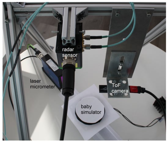 Figure 3 shows the complete hardware setup made up of the radar sensor, the ToF camera and the baby simulator. The baby simulator is placed between the emitter and receiver of the laser micrometer. As can be seen, it is covered with paper in order to reduce reflections within the ToF point cloud arising from any dark object in front of a light surface. The radar sensor is positioned at a distance of cm from the table and the ToF camera at a distance of cm. Those dimensions correspond to the distances within our incubator. All different sensors are now described in detail.