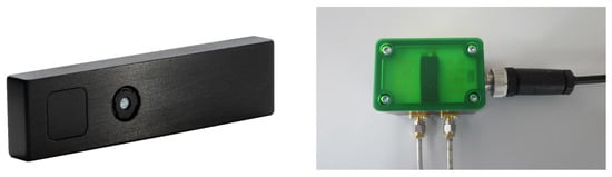 The 3D time-of-flight (ToF) camera used is the CamBoard pico flexx by the company pmd (see Figure 4). The camera has a measurement range of 0.1–4 m, a field of view (FoV) of 62° × 45° and a resolution of 224 × 171 (38 k) pixels. A frame rate of up to 45 fps (3D frames) is given. The camera is connected via USB to an Ubuntu 16.04 computer with Robot Operating System (ROS) Kinetic installed. The used driver is the Royale SDK provided by the manufacturer as well as the ROS package pico_flexx_driver [61]. For our purpose, a frame rate of 35 fps is set.