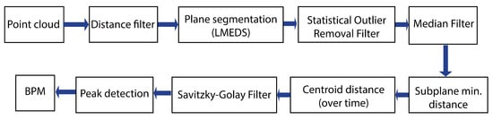 The signal processing flow chart for the respiratory rate detection using the ToF camera can be seen in Figure 6. The ToF camera delivers a 3D point cloud. First, a distance filter is applied to remove all points which are further than 20 cm away from the camera as these points would correspond to the table plane and are not of interest. In the next step, a plane segmentation from the Point Cloud Library (PCL) based on the Least Median of Squares (LMEDS) is applied [67,68]. The chosen model type is called SACMODEL_PLANE. The distance threshold is set to 2 cm and specifies that points with a maximal distance of 2 cm from each other belong to the same plane. To remove outliers caused by reflections at the edges, a Statistical Outlier Removal filter [69] with a standard deviation multiplier of and neighbors is used. For noise reduction, a Median filter [70] is applied with a maximum_allowed_movement of 3 mm (distance that a depth pixel is allowed to move when the filter is applied). In Figure 7, the effect of the Statistical Outlier Removal filter and the Median filter can be seen.