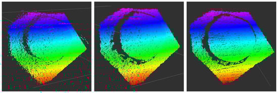 Plane without filtering (left) and with applied Statistical Outlier Removal Filter (middle). It can be seen that outliers at the edges are removed. When applying the Median filter, further smoothing of the point cloud occurs (right).