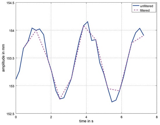 The mean of the BPM values of the three packages is used to parameterize the Savitzky–Golay filter based on Gram polynomials [72,73] in order to remove artifacts. Depending on the first BPM value, the window size and polynomial order varies (see Table 1). The grade of filtering depends on the frequency as there is more noise within the lower frequency region which means that a greater measure of filtering is needed. The ideal filter parameters were determined empirically. In Figure 8, a section of the unfiltered and the filtered respiration signal at 20 BPM in deep mode is displayed. From then on as before, a peak detection is used for the filtered values to determine the number of peaks within one data package over time. Once there are 18 packages (of 33 values each) with the Savitzky–Golay filter applied, a moving average window is used which moves by one data package of 33 values.
