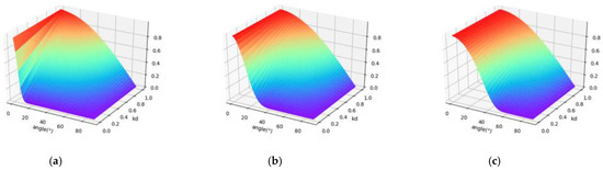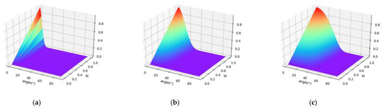 The variation of the backscatter intensity, , with the incident angle, θ, and . Parameter m is fixed at 0.1, 0.3, and 0.5, respectively. (a) m = 0.1; (b) m = 0.3; (c) m = 0.5.