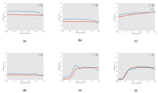 In order to compare the reflectance obtained by active and passive methods and verify the spectral analysis ability of HSL, we compared the spectral reflectance measured by HSL (active method) with that measured by a Spectra Vista Corporation (SVC) spectrometer (passive method) in the corresponding wavelength range at the angle of normal incidence. The results of the HSL and SVC spectrometer were compared and used for spectral analysis.
