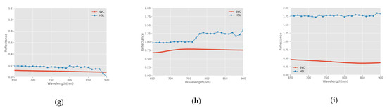 Reflectance comparison of HSL and SVC spectrometer. (a) 70% standard reference board; (b) 40% standard reference board; (c) Wood product; (d) Sidewalk brick; (e) Ficus elastic; (f) Codiaeum variegatum; (g) Marble tile; (h) Floor tile; (i) Car shell sample.
