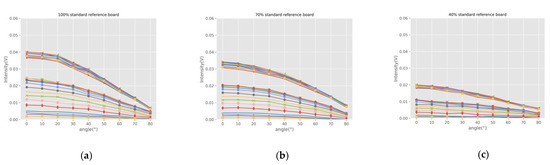 In order to analyze the incident angle effect of samples with different reflection characteristics, we drew the curves of backscatter intensity, varying with the angle. Figure 6 shows the incidence angle effect at different wavelengths measured with the HSL for the samples. The intensity curves of twenty-six wavelengths present similar features. As can be seen from the whole, the backscatter intensity decreases as the incidence angle increases for a fixed distance sample. For different samples at the same incidence angle, the intensity is proportional to the reflectance. It shows that the incidence angle significantly affects the originally recorded backscatter intensity.