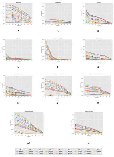 Incidence angle effect at different wavelengths measured with the HSL. (a) 100% standard reference board; (b) 70% standard reference board; (c) 40% standard reference board; (d) Wood product; (e) Sidewalk brick; (f) Floor tile; (g) Marble tile; (h) Car shell sample; (i) Ficus elastic; (j) Codiaeum variegatum; (k) Fraxinus pennsylvanica; (l) Yellow leaf of Fraxinus pennsylvanica; (m) Eucommia ulmoides; (n) Magnolia denudate.