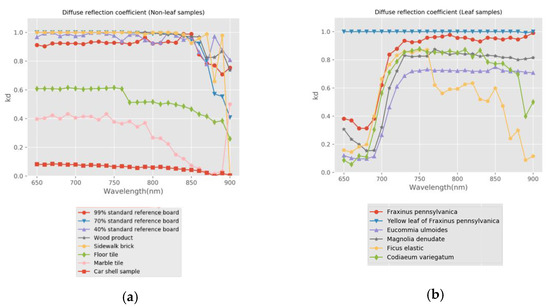 The relationship between diffuse reflection coefficient, , and wavelength, . (a) Non-leaf samples; (b) Leaf samples.