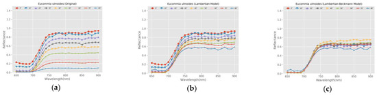 The reflectance comparison of Eucommia ulmoides. (a) Before calibration; (b) Calibration results of Lambertian model; (c) Calibration results of Lambertian–Beckmann model.