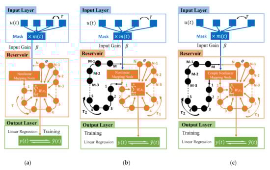 Reservoir computing (RC) is a brain-inspired computational framework suited for temporal data processing, owing to its derivation from the recurrent neural network (RNN) [5,7]. The main difference between RC and conventional RNNs is that the weights on the recurrent connections in the reservoir are not trained, but only the weights in the readout are trained, which avoids the well-known limitations of RNN, such as iterative parameter optimization and the condition of convergence [8]. More importantly, the fixed reservoir without updating is suitable for hardware implementation using various nonlinear dynamical systems. The hardware reservoir needs two crucial properties, nonlinearity and fading memory, which can be realized by using numerous randomly interacting nonlinear nodes or using a time-delayed nonlinear system. Actually, RC based on the time-delayed nonlinear system greatly reduces the implementation difficulty, which has been successfully demonstrated in a wide variety of systems, such as memristor [9,10], electronic [8,11,12], spintronic [13,14,15], optoelectronic [16,17,18], all-optical [19,20,21,22], quantum [23], and mechanical resonator [24,25,26,27]. In spite of these encouraging results, the RC implementation based on the single nonlinear node with single time-delay feedback adopted in these previous works has a limited memory capacity. The memory capacity is a key property of the RC that allows the processing of dynamical signals. The RC structures with the multiple delayed feedback or bidirectionally coupled nodes was proven to increase the processing speed of the system by boosting the memory length of the RC system, which are discussed numerically in detail in Appeltant’s doctoral dissertation [28]. Furthermore, this pioneering work inspires many studies on different configurations for the time-delayed RC. Particularly, double optical feedbacks RC structures are proposed to increase prediction performance under the condition that the long delay time and short delay time meet the specific relationship [29]. In addition, the mutually delay-coupled semiconductor lasers structure was studied for enhancing calculation speed and accuracy of the RC systems [30,31,32]. Despite these instructive works based on the optoelectronic devices promoting research on RC with the multiple delayed feedbacks and coupled nonlinear nodes, the potential of RC with other nonlinear devices and the reason why the coupled RC structure improves the accuracy has not yet been fully investigated.