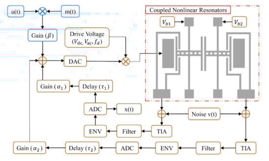 In this paper, we propose the coupled nonlinear mapping nodes to enhance the transforming property of CRSD, as illustrated in Figure 2. There are two resonators, Resonator 1 on the left and Resonator 2 on the right, enclosed by the red dotted line [36]. For subsequent silicon on glass (SOG) processing in our future work, each clamped-clamped beam is designed to be thick, long, and wide, with a gap of between two beams. Resonator 1 is driven and sensed using capacitive transduction while another vibrates simultaneously because of electrostatic coupling. The actuation is achieved using parallel plates of equal dimensions with in length and in thickness. The gaps of electrostatic drive and electrostatic detection are both . The dynamics of the system is approximated by these equations: