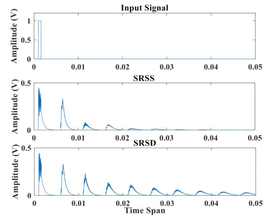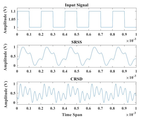 Delay characteristic diagram of two structures. From top to bottom, respectively, waveforms show the input signal, the output signal of SRSS, and the output signal of SRSD.