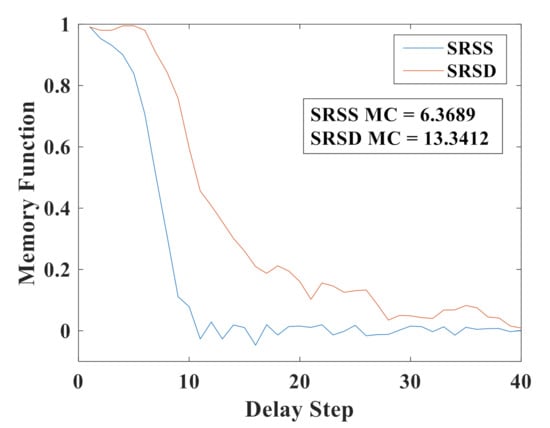 Figure 4 shows the memory function as the function of the delay step of two RC structures. The blue line stands for the SRSS. The memory function decreases sharply with the increase of delay step. When the delay step increases to 10, the value of the memory function decays to near 0. That means this SRSS is not well suited for long-term prediction tasks. The red line represents the SRSD. When the delay step is less than seven, the memory function almost has no attenuation. When the range of the delay step is 7~28, the memory function decreases gradually. The MC of SRSD is 13.3412, which is more than twice that of SRSS, whose MC equals 6.3689.