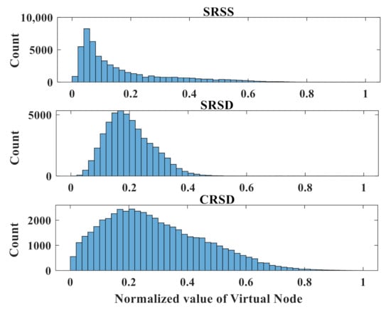 The histogram of the virtual nodes in three RC structures. From top to bottom, the histogram shows the virtual nodes of SRSS, SRSD, CRSD. For the convenience of comparison, the values of virtual nodes are all normalized.