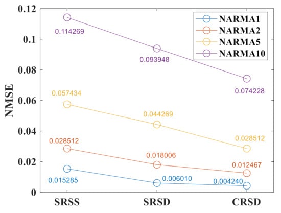 Figure 8 shows the performance of three RC systems for the NARMA prediction test. The lines with different colors represent the different orders of prediction. The driving frequency z in SRSS and SRSD, while z in CRSD. The delay feedback loop in SRSS, while , in SRSD and CRSD with two delay feedback loops. In the same structure, the NMSE increases gradually with the increase of order because of increasing difficulty. Under the condition of the same order , the NMSE decreases as the structure is optimized from SRSS to SRSD to CRSD at the same time. When , CRSD reduces the NMSE of the system by around 70% from SRSS, and when , CRSD reduces the NMSE of the system by around 50%. Concurrently, CRSD reduces the NMSE of the system by around 35%.