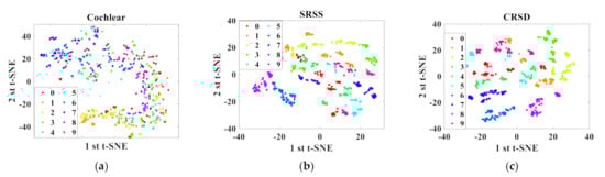 Two-dimensional representation of the two t-SNE components for SRSS and CRSD: (a) t-SNE result of TI-46. raw data only after processing by the Lyon cochlear ear model; (b) t-SNE result of TI-46 data after preprocessing by SRSS; and (c) t-SNE result of TI-46 data after preprocessing by CRSD.