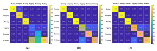 The confusion matrixes of the human action recognition benchmark show the probability (colors) that a motion presented to the system (columns) is classified to a certain motion (lines). (a) Confusion matrices for the SRSS with the success rate = 73.3% (b) Confusion matrices for the SRSD with the success rate = 89.33%. (c) Confusion matrices for the CRSD with the success rate = 92%.