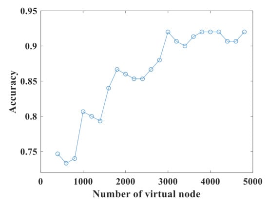 In addition, we test the effect of the number of virtual nodes on the accuracy rate of the CRSD system. The number of virtual nodes is a crucial parameter for RC because it determines the speed as well as the performance of the system. If is relatively small, the performance will decrease, but the system operation speed will increase on the contrary. A higher usually means better state diversity, which improves performance at the expense of lower computing speed. Because this recognition video data set has a much higher data complexity than the other three above, more virtual nodes are needed to process the data to increase the accuracy rate. The photonic computer gets the accuracy rate = 91.3% at the condition of [46]. In our test, the accuracy rate as a function of the number of virtual nodes is shown in Figure 11. In the range of to , as the number of virtual nodes increases, the accuracy rate increases significantly. When , the accuracy rate fluctuates in a small range and gradually stabilizes. The simulation time increases rapidly as the number of virtual nodes increases. If increasing the number of virtual nodes does not increase the accuracy rate, then too large a number of virtual nodes will seriously affect the calculation efficiency. As a compromise between the performance and the efficiency, we choose N = 3000 in this task.
