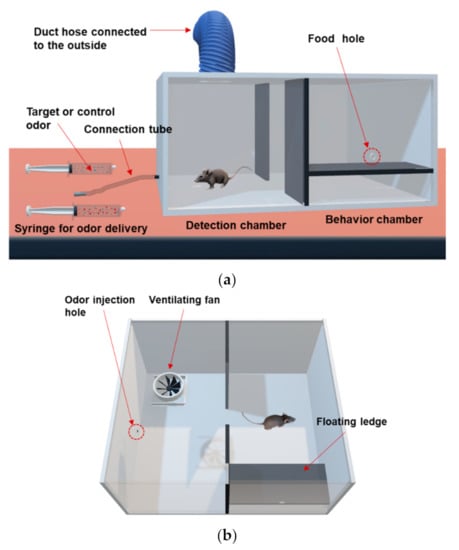 Figure 2a,b represent a schematic diagram showing the layout of the odor discrimination training system. There are two chambers separated by a plate on both sides of the training device. One is the detection chamber where odors are provided through the odor injection hole. The other is the behavior chamber where animals exhibit target behaviors in response to the injected odors, followed by rewards and punishments according to their resulting behaviors. The separation plate is removed as a signal for odor injection, and target or control odors are injected from the injection unit. Injection unit consists of an odor tube and syringe. The odors are delivered into the chamber through an odor injection hole connected to the odor tube attached to the syringe. The target odor is prepared from a spiked sample in which toluene is mixed with an exhaled breath, while the control odor is prepared from an unspiked breath. The animal sniffs through the odor injection hole and determines whether to perform a signaling behavior. If the animal senses the target odor, it will move to the behavior chamber, jump onto the floating ledge, and receive a food reward. Otherwise, if a control odor is provided, the animal’s target behavior is to stay in the detection chamber instead of moving to the behavior chamber.