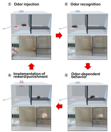 Four key steps for odor discrimination training. Step 1: odor injection. Step 2: odor recognition. Step 3: odor-dependent behavior. Step 4: implementation of reward/punishment.