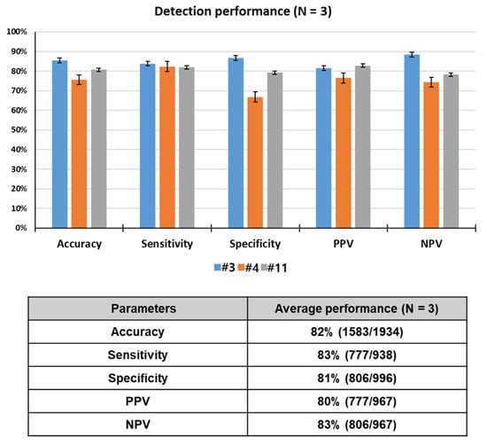To assess the odor discrimination performance, 15 rats were trained using breath samples spiked with toluene, one of lung cancer-related VOCs. Twelve rats among 15 trained rats reached performance criterion in 12 consecutive successful tests within a given set, or over 12 sets, with a success rate of over 90%. Here, data for only 3 rats showing the best detection performance out of the 12 rats that were trained are reported. Unlike device-based sensors, a live animal-based biosensor, which detects a specific odor through olfactory learning of the animal, has variables of the animal itself, in addition to the experimental and environmental variables. For this reason, only 25–33% of a population of candidate drug (or explosive) detection dogs can pass the thorough training program. Something similar goes for the detection rats. That is why we selected the three best performing rats in this study. The rats (N = 3) required 38 sets of training (= 760 tests) to learn to discriminate between target and control odors or to make odor-reward association. All of the trained rats reached the performance criterion, in 12 consecutive successful tests within a given set or over 12 sets with a success rate of over 90%, in acquisition of olfactory discrimination between two odors. The lowest and highest number of sets that achieved the criterion for toluene detection were 30 (600 tests) and 54 (1080 tests), respectively. As shown Figure 4, the rats showed excellent performance, discriminating the toluene-spiked samples with 82% accuracy, 83% sensitivity, 81% specificity, 80% PPV, and 83% NPV through a total of 1934 tests. These results indicate that the rats were efficiently trained in the training device to acquire the odor discrimination.