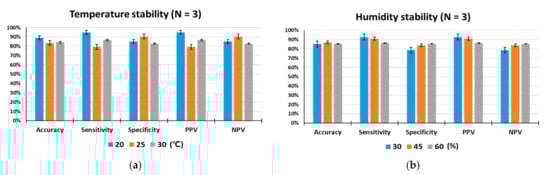 Since detection rats are living organisms, they are more susceptible to environmental conditions than device-based sensors. In particular, environmental temperature and humidity are important factors that can influence the odor detection performance. To test the influences of temperature and humidity on the animal sensor responses, indoor air temperatures were maintained at 20 °C, 25 °C, and 30 °C, while relative humidity was set at 45% RH, and indoor humidity levels were kept at 30%, 45%, and 60%, while the temperature was set at 25 °C. As shown in Figure 5a,b, under controlled laboratory conditions, the target odor was discriminated by the trained rats with outstanding performance for olfactory detection of toluene. The performance of all rats measured under given temperature and humidity conditions was within a deviation range of ±10%, indicating that animal nose sensors showed excellent environmental stability. There were no obvious differences in accuracy, specificity or NPV among the three specified temperature levels. However, when the temperature was 20 °C, some increases in sensitivity and PPV were observed compared to the conditions at 25 °C and 30 °C.