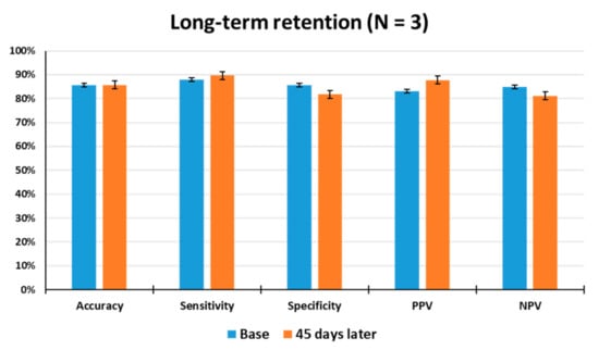 The long-term retention of odor discrimination must be critically considered for practical use of the animal nose sensor. In an attempt to gain insight into the long-term stability of the animals, the odor detection performance of the trained rats was examined 45 days after the last discrimination learning set. As shown in Figure 6, when tested 45 days after training, the average accuracy, sensitivity, specificity, PPV, and NPV of the rats (N = 3) were observed to be 86%, 90%, 82%, 88%, and 81% through a total of 129 tests, respectively, indicating that they had good retention of odor information over a long period of time. The tested rats showed no significant differences in accuracy from the first set of odor discrimination to the last set. This result indicates that long-term memory for toluene appears to be unimpaired in all of the tested rats, thereby demonstrating that the odor discrimination system is useful to train rodents to learn to discriminate between target and non-target odors or to make odor-reward association.