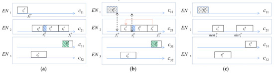- The set of running edge nodes near the user is sorted in ascending order of remaining processing capability , and these nodes are traversed in turn and judged to be able to create new containers (processing capacity is denoted by ) to accommodate the task copy (lines 1–7). If there is no suitable running node, some containers are migrated to a nearby running node to make space to create a new container (lines 8–11).