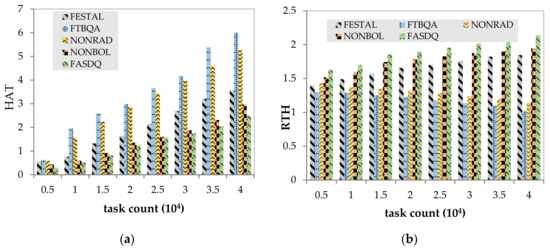 - Fault-tolerant elastic scheduling algorithm (FESTAL) [17]: it can be added or removed certain virtual machines depending on the load state to optimize resource utilization while supporting fault tolerance in the cloud. In terms of using virtualization technology, the approach in this paper uses the more lightweight container virtualization technology. This experiment applied FESTAL to the edge side for comparative experiments to verify the effectiveness of FASDQ in terms of latency and resource utilization.
