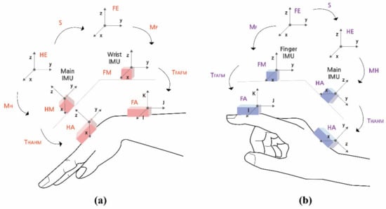 A coordinate system related to joint angle estimation: (a) hand to wrist; (b) finger to hand [].