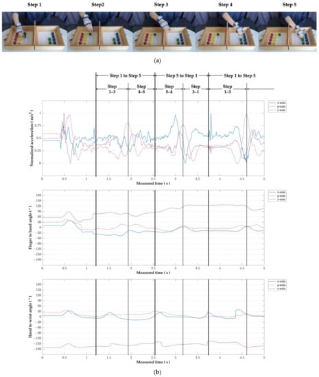 Hand movement sequences in Experiment 1: a targeted box and blocks test. (a) Motion sequence depiction in 5 steps; (b) IMU sensor output graph and intervals where the five-step motion sequence happens.