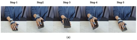 Figure 4a depicts the hand movement sequence for Experiment 2, which consisted of the following five steps: reaching, lifting, flipping, facing down, and placing back a mobile on the table. In juxtaposition to Experiment 1, the subjects were not asked to complete the assigned scenario as quickly as possible. Instead, Experiment 2 aimed to collect subjects’ natural hand-object manipulation movements while increasing the task complexity such as a flipping hand motion (i.e., reversing the smartphone with the screen facing up and down).