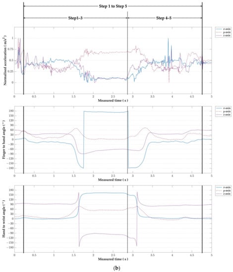 Figure 3b shows an example of the subject’s hand movement with several metrics: the thumb’s normalised acceleration () and the Euler angles for the finger and hand and for the hand and wrist, which corresponds to a series of steps to complete the tBBT. The thumb’s acceleration () was normalised between 0 to 1 according to Equation (3).