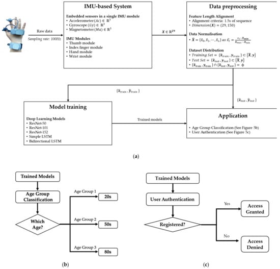 Figure 5a describes the flow of the authentication model, including collecting the wearable IMU sensor data, pre-processing the collected data, and feeding these data to the different deep-learning-based models that are trained to capture the hand behaviour patterns of users in object manipulation, aiming for user classification and authentication. Figure 5b,c describes the system flow of age-group classification and user authentication in practical cases, respectively.