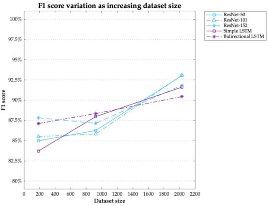 In both deep neural networks, the F1 score tended to increase with the volume of the training dataset. Although the graph conveyed mixed interpretation concerning the overall performance between the ResNets and LSTMs in the case of a small training dataset, there is a clear tendency of the ResNet models’ performance dramatically improving as the volume of the training dataset increases.