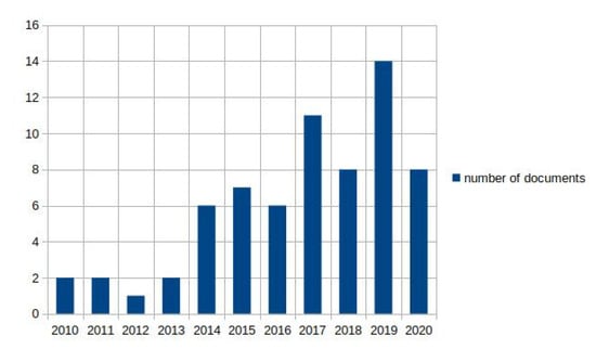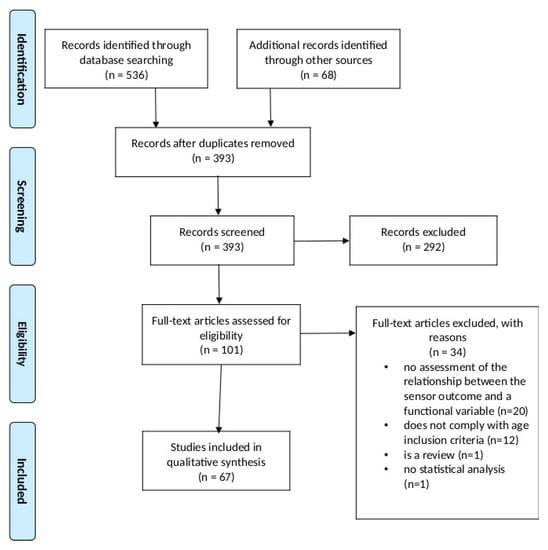 In total, 536 citations were identified from the electronic databases (MEDLINE (PubMed), SCOPUS, and Web of Science), and 68 additional citations were identified through other sources. Forty-three of them came from citations previously identified by the review team, and 25 of them came from scanning the list of reference of the studies included for analysis in subsequent stages of the review. Out of these, 393 citations entered the screening stage after removing duplicates, and 292 citations were excluded during the screening stage based on the information in the documents’ titles and abstracts. The full texts of the remaining 101 citations were retrieved and assessed for eligibility. Of these, 34 documents were excluded for the following reasons: 20 of them did not assess the relationship between the sensor outcome and any functional variables, 12 of them did not comply with the age inclusion criteria, one of them was a review, and another one involved a single participant, and their results were not based on any statistical analyses. Thus, 67 studies were included for analysis in this review. Of these, 59 documents (88%) were journal articles, six documents (9%) were contributions to conferences, and two documents (3%) were book chapters. The number of documents over time is depicted in Figure 2. There is a trend to an annual increase in the number of publications from 2014 onwards, with a notable exception corresponding to the year 2020.