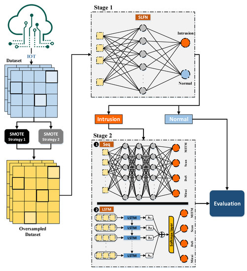 - Qaddoura, R.; Al-Zoubi, A.; Almomani, I.; Faris, H. A Multi-Stage Classification Approach for IoT Intrusion Detection Based on Clustering with Oversampling. Appl. Sci. 2021, 11, 3022. [Google Scholar] [CrossRef]