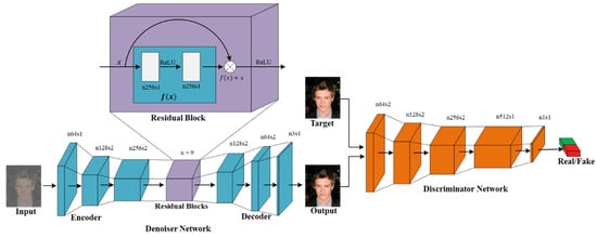 In this study, we used two kinds of pair training examples, that is, a set of noisy input images , and a set of clean target images . The denoiser network was trained so that the constructed noise-free images were similar to the actual clean target images, and we simultaneously trained the discriminator network, , to differentiate the fake constructed noise-free photos from the actual clean photos. The denoiser learns the transformation from a noisy-domain to a clean real-domain through minimizing the adversarial losses, attempting to trick the discriminative network. The denoising network contains an encoder network , residual blocks layer , and the decoder network . The encoder includes a set of downsampling convolutional layers that transform a noisy image into some feature domains . Later, these feature domains, , feed to the residual blocks [47]. The output feature maps of residual blocks, , becomes the input of the decoder network . At that point, a series of up sampling transposed convolution layers decode the transformed feature maps into fake constructed clean image . The output of the denoising network is described in Equation (1).