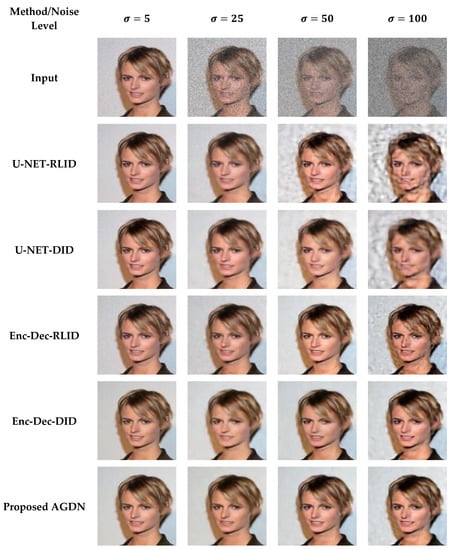 We observed from Figure 6 that the RLID method produces visual artifacts. It failed to produce pleasing images for the higher noise level, which shows that the model learns from direct clean targeted images easier than learning the noise image first and then constructing the target image. The U-NET structure failed to reconstruct the target images for high-level noisy input images because the skip-connections carry unwanted details from the input images, severely influencing the output images, causing distorted results, and failing to construct the clean target images. However, the DID using an encoder-decoder structure’s network produces good and less image artifacts for low and higher noise levels.