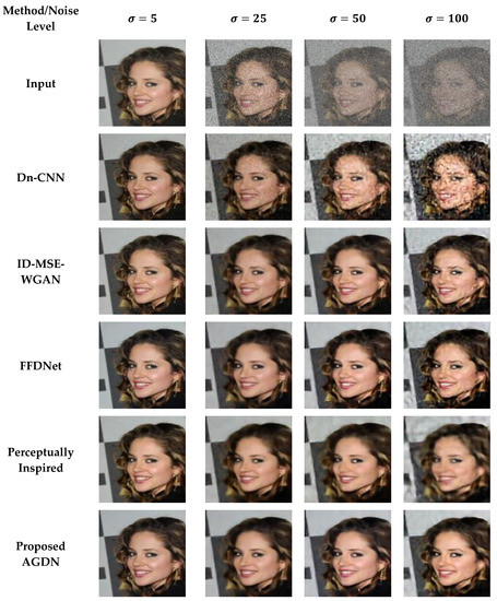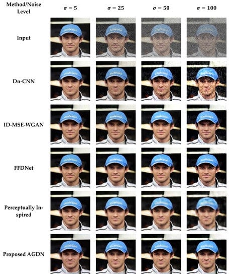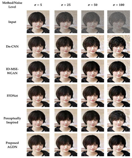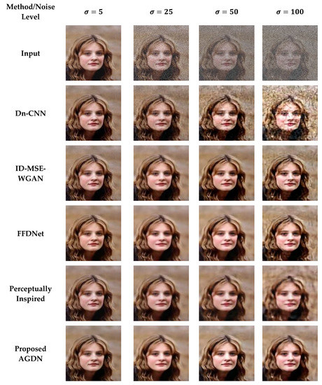 We attempt to denoise the AWGN’s multiple noise levels on the Partial-CelebA dataset, as shown in Figure 7. More examples are given in Figure 8, Figure 9 and Figure 10. The network is trained on 1500 images and tested on 500 images of the Partial-CelebA dataset for each noise level. We run tests on 500 test images for fair comparison and take the average to calculate quantitative scores of PSNR, SSIM, UQI, and VIF. Table 9 presents the quantitative comparison of state-of-the-art methods and the proposed method. Table 9 shows that for the noise level of sigma 5, the ID-MSE-WGAN, the perceptually inspired method, and the Dn-CNN achieve reasonably good scores in PSNR, SSIM, UQI, VIF, and FID. However, when the noise level increases, these methods fail to construct pleasing images. One possible reason is that the Dn-CNN and the ID-MSE-WGAN learn the noise image first instead of directly learning the target image. As the noise level increases, it becomes harder for the network to learn noise images first and then construct the target images compared to learning the target image directly.