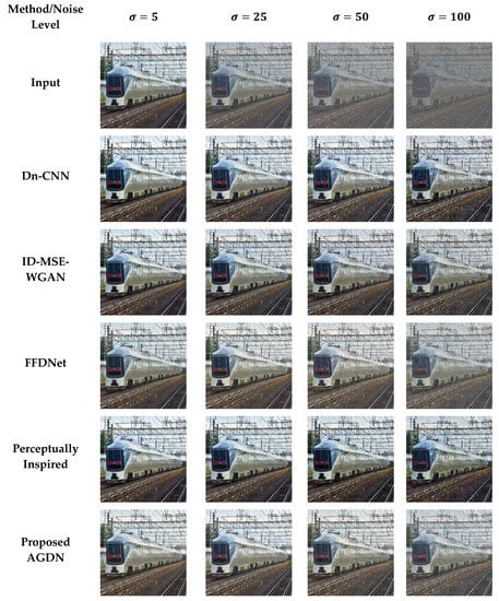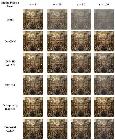 where is the target original image and is the corresponding noisy image produced via AWGN; and , with standard deviation . The number of experiments was undertaken on four different noise levels by changing the numerical value of as 5, 25, 50, and 100 for both datasets.