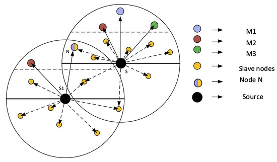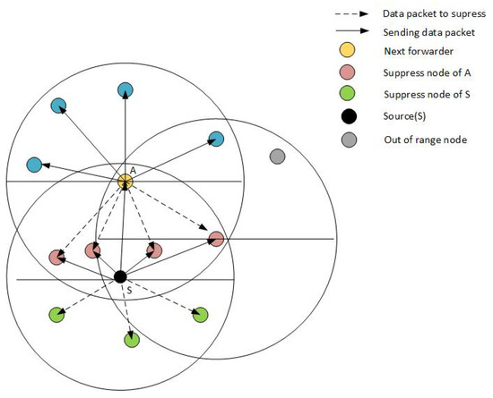 Our approach minimizes the data packet reception in the PFNs of a node that is not eligible to send data (i.e., slave nodes). In prior routing protocols, all PFNs receive the data packet; however, eventually, further transmission is carried out by one of them. Since we are focusing on optimizing our network in terms of energy, we cannot afford wastage of energy in the form of receiving energy. Therefore, we adopted a method that suppresses all nodes, ineligible for forwarding the data packet to save the receiving energy. One possible scenario is depicted in Figure 10. As shown in the figure, a node suppressed by the sender node may also reside in some other node’s range, while this node is the master node of its own PFN i.e., Node N is the slave node of Node S1 but the master node of S and therefore can receive data packets from S1 but not from S.