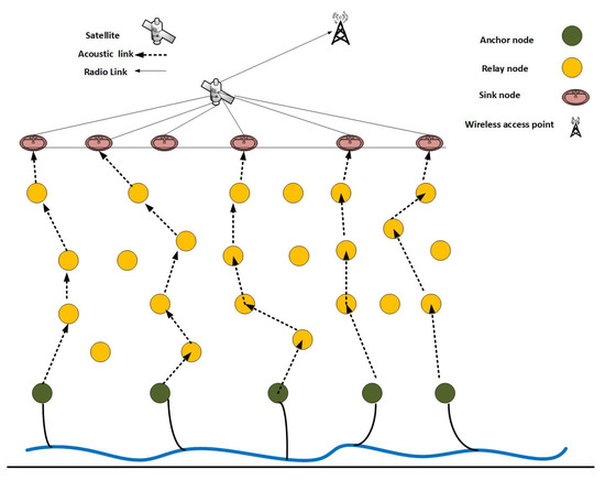 The network architecture of ERPMSA-UWSN is constituted of anchor nodes, relay nodes, and sink nodes as depicted in Figure 2. Sink nodes float on the surface bearing radio and acoustic modems to communicate with each other and relay nodes, respectively. These nodes can receive signals from water and perform the transmission/reception in the external environment without any boundaries. Relay nodes are deployed at different levels of depth, act as the 3rd party between the transmitters (anchor nodes) and receivers (sink nodes), and carry the transmitted data towards the receiver. Anchor nodes are tethered alongside seabed and can move with water currents or with other environmental disruption. Their main task is to gather environmental data and pass it to the sink nodes via relay nodes. The centralized stations are the sink nodes that enable communication with other sink nodes as well as relay nodes. The reception of the data packet on any of the sink nodes is measured as a successful packet delivery.