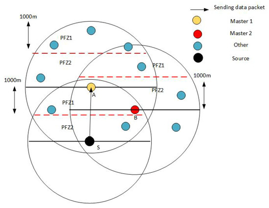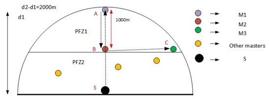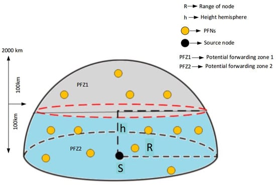 In this scheme, the division of PFZ into different PFZ levels is based on the depth difference of the source node and the PFN zone. To achieve optimal transmission of the data packet, we tend to access the master node closer to the sink. For this purpose, PFZ is divided into two equal regions based on the depth difference as shown in Figure 3. As the transmission range is 2000 m, the region where the depth difference is between 1001 m to 2000 m is considered to be PFZ1, while from 1 m to 1000 m, it is considered to be PFZ2. This 3D division results in a truncated hemisphere with an upper cap (PFZ1).